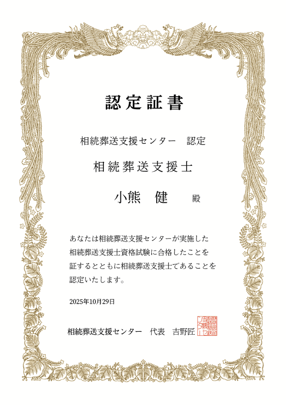 一般財団法人 遺品整理士認定協会の養成講座を修了し、「遺品整理士」として認定を受けています。どうぞ安心してご相談ください。